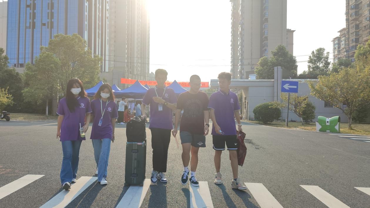 迎新工作人员带新生去迎新点报到