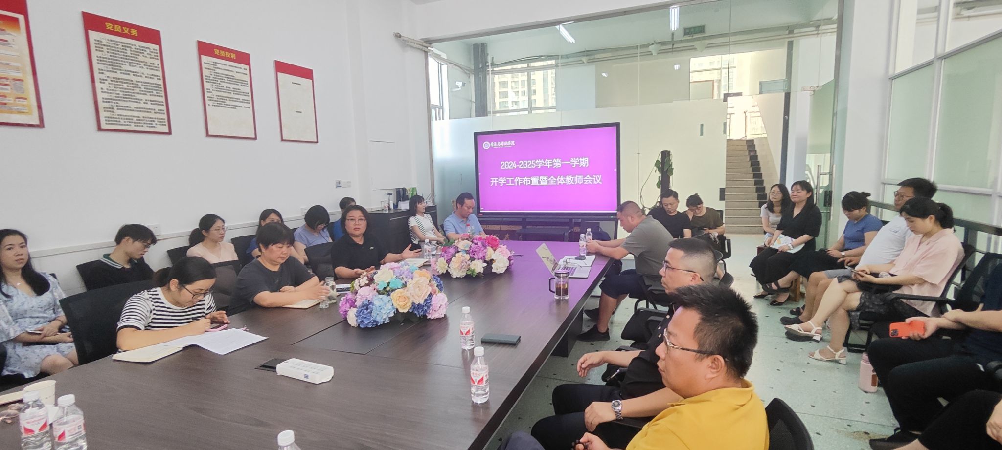 曾遴琳副书记通报了人才招聘和暑假员工“三下乡”等工作完成情况。宣布了新生班主任名单和24级兼职辅导员名单,详细安排了迎新工作。提醒全体教师密切关注员工的思想动态,及时发现并解决员工的各种问题。