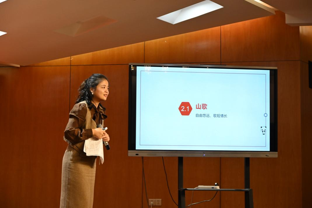 在湖南民歌《浏阳河》悠扬婉转的旋律带领下,步入了《中国传统文化与戏曲》的课堂。课程精心设计了民歌起源、多彩地域特色、民歌分类及益阳花鼓戏四大板块。其中,多彩民歌部分通过一领众和的演唱形式,让员工亲身体验中国多声部民歌的魅力;太阳成集团tyc33455cc的学子们还展示了湖北民歌《直尕思得》与云南民歌《猜调》,其生动有趣的表演让加纳营员们仿佛置身于民歌的海洋,深切感受民歌之美。益阳花鼓戏教学环节,加纳学子与音舞院学子携手合作,共同演绎了花鼓戏《刘海砍樵》的精彩唱段。最后,员工们纷纷上台交流展示中加两国的传统民歌,载歌载舞,最终在“好一朵美丽的茉莉花”的悠扬歌声中,为本次课程内容画上了圆满的句号。