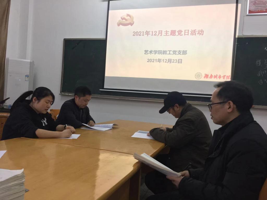 2021年12月23日下午2点,美术学系党支部在教研室召开12月主题党日活动,重点学习了《习近平主持召开中央全面深化改革委员会第二十三次会议强调: 深入推进世界一流大学和一流团队建设》、《学习中国共产党第十九届中央委员会第六次全体会议精神》、《湖南省第十二次党代会精神》等重要文件,并组织老师对师德警示教育相关案例进行分析与讨论。