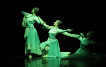 “欲把西湖比西子,淡妆浓抹总相宜” 这是苏轼饮酒未尽,饱览西湖上晴与雨两种截然不同的风光,赞叹而道之词。他把西湖比作西子,空蒙山色是她淡雅的妆饰,潋滟水光是她浓艳的粉脂。正如舞蹈《西子湖·初妆》,是朦胧烟雨中的山水,是破晓远天外的虹霓。云雾弥漫,似有若无。