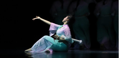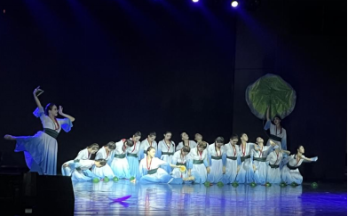 “越江女,越江莲,齐菡萏,双婵娟。嬉游向何处,采摘且同船。”女子古典群舞《莲鼓越歌行》取材于传统的江南水乡花鼓文化,将其融入古典舞中,“敲击”出了江南水乡的采莲美景。描绘出一幅江南水乡采莲女嘻戏欢唱的生活画面。舞蹈在“诗画浙江”的大背景创作产生,将我国自古以来的“放河灯”祈愿仪式融入古代吴越地区的“响屐舞”,让观众领略到:“越溪素足女,婉笑青眉扬。泛水采芙蓉,归来衣更香”的江南水乡独有气息。