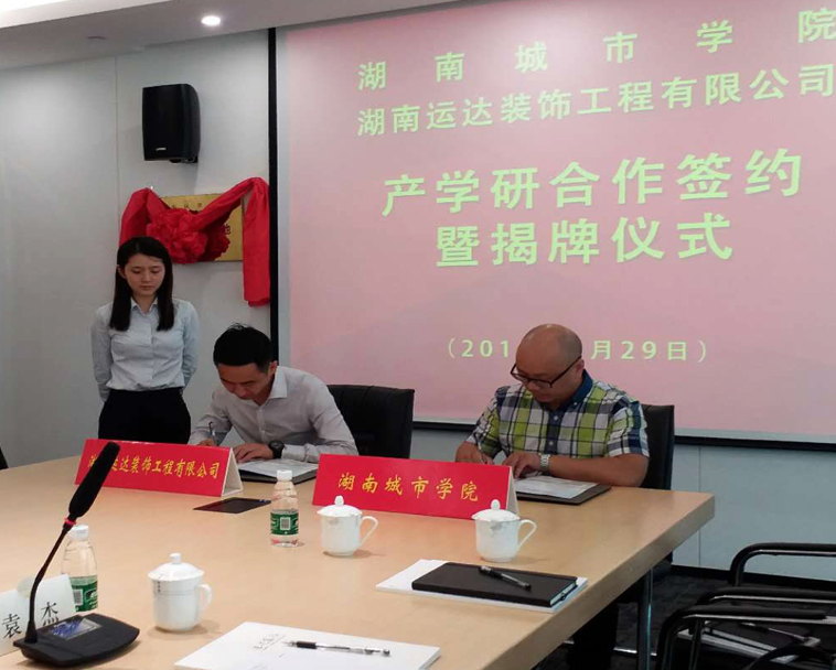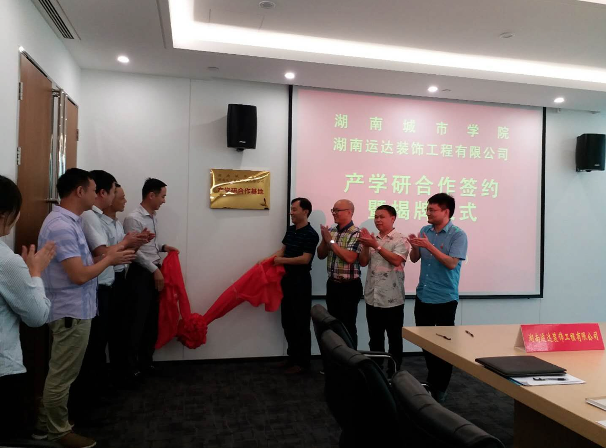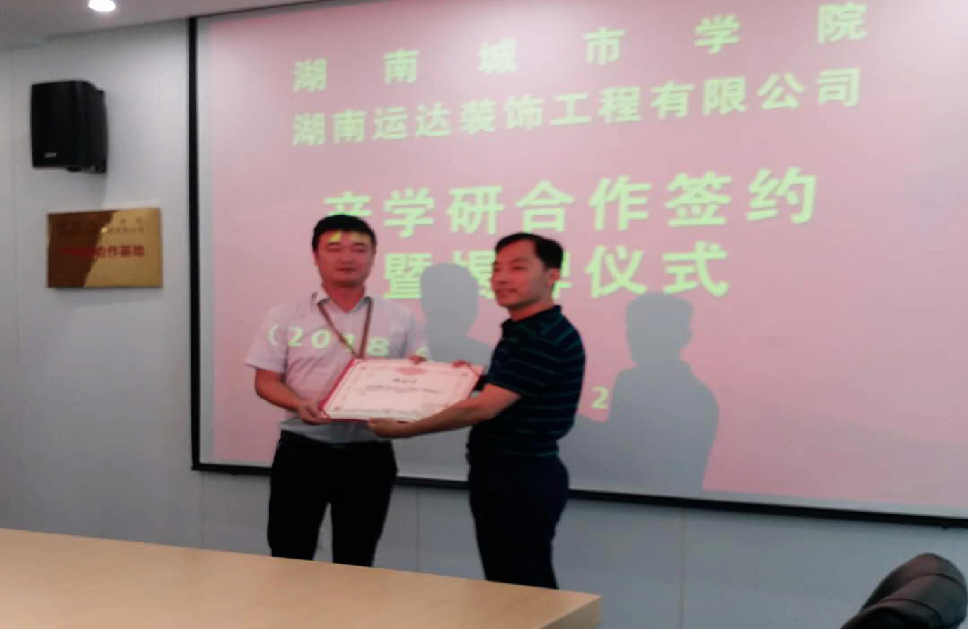 仪式上,张清华简要介绍了公司基本情况。他表示,一直以来,公司谋求与知名企业合作,湖南运达装饰工程公司是湖南和全国知名建筑品牌企业,而公司环境装饰设计专业在人才培养方面具有一定的实力,双方有着广泛的合作空间。孙红权、王雨峰分别介绍了环境设计专业的优势特色以及近年来产学研取得的成绩,并就合作后续工作提出建议。会上,张清华、孙红权分别为企业特聘教师代表刘振兴和熊立波颁发聘书,双方签署产学研、就业合作协议并为产学研合作基地牌。