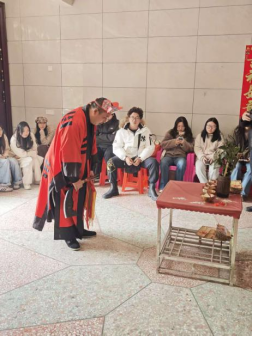 在仪式进行的中场休息时间,同学们怀揣着疑问向在场的师傅们虚心请教,师傅们热诚解答关于当地傩文化的历史背景,此次仪式的主题,傩文化在当地的影响力和对于傩文化的传承与发展的问题。此次与专业师傅的互动中让同学们对傩戏艺术的认知又多了一层鲜活的实践注解。