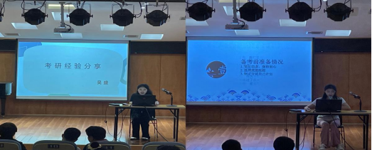 今年考研成功的19级吴盛和翟婷向大家分享了考研经验,介绍了各自的考研学习方法、时间安排和心态调整等策略,不仅为正在准备考研的同学提供了经验方法,也提醒有考研意向的同学要及早规划,在大一大二打好基础。两位同学还与低年级同学进行了互动答疑。