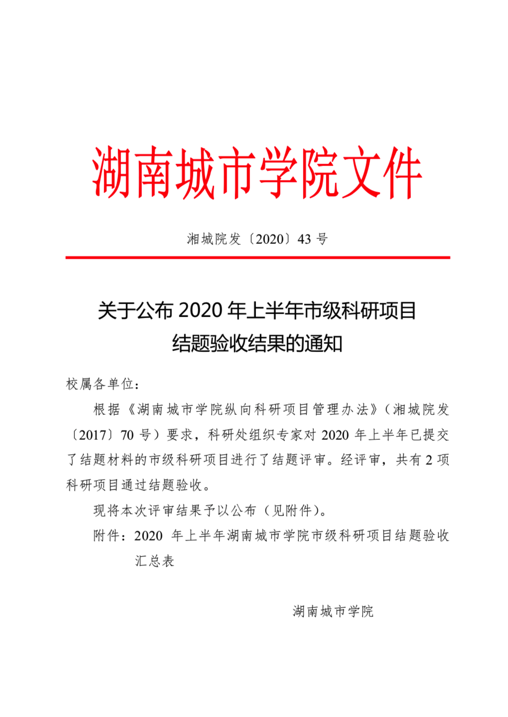 湘城院发〔2020〕43号关于公布2020年上半年市级科研项目结题验收结果的通知