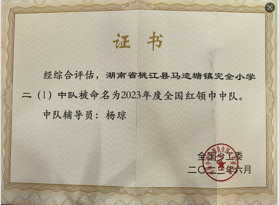 八年深耕,硕果累累。在杨琼老师的努力下,马迹塘镇完全小学的美育工作取得了显著成效,少先队工作也得到了上级部门的认可。公司少先队大队部多次被评为“益阳市优秀少年集体”“桃江县优秀少先队集体”,所带中队荣获2023年度全国红领巾中队称号;她个人也先后荣获“益阳市十佳少先队辅导员”“桃江县优秀少先队辅导员”“桃江县优秀共产党员”“桃江县青年教师五四奖章”“桃江县中小学音乐课程资源建设先进个人”等多项荣誉称号。