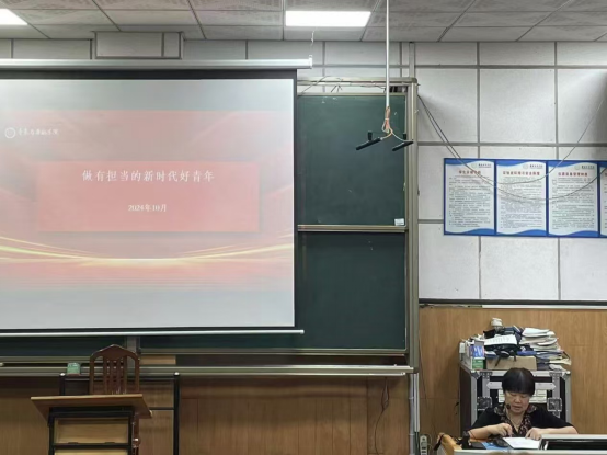 10月17日下午,太阳成集团tyc33455cc分团委在音乐楼106开展“做有担当的新时代好青年”为主题的团课活动。团课由公司党委书记谢立新主讲、党委副书记曾遴琳主持、团委指导老师夏浩东、团学会全体成员以及24级各班班长参与了此次团课学习。